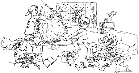 Meet the WillSanta Kids - Snappy, Tammy, Duffy, Charlton and Elise, five adorable, bright-eyed children and the lovable dog, Loner. This scene of these enterprising kids getting ready for a festive Christmas can be downloaded for coloring. Please come back and visit to view more coloring book additions!